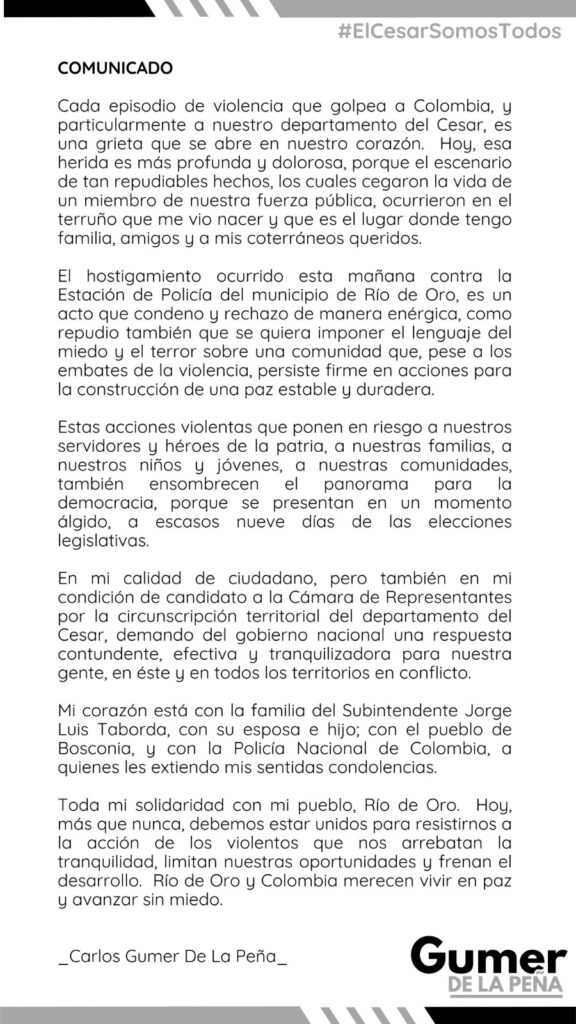 Tras el hostigamiento contra la Estación de Policía de Río de Oro, que dejó como saldo la muerte de un miembro de la Policía Nacional, el candidato a la Cámara de Representantes por el Cesar, Gumer De La Peña, expresó su rechazo contundente frente a los hechos y envió un mensaje de solidaridad a las víctimas y a la comunidad.
