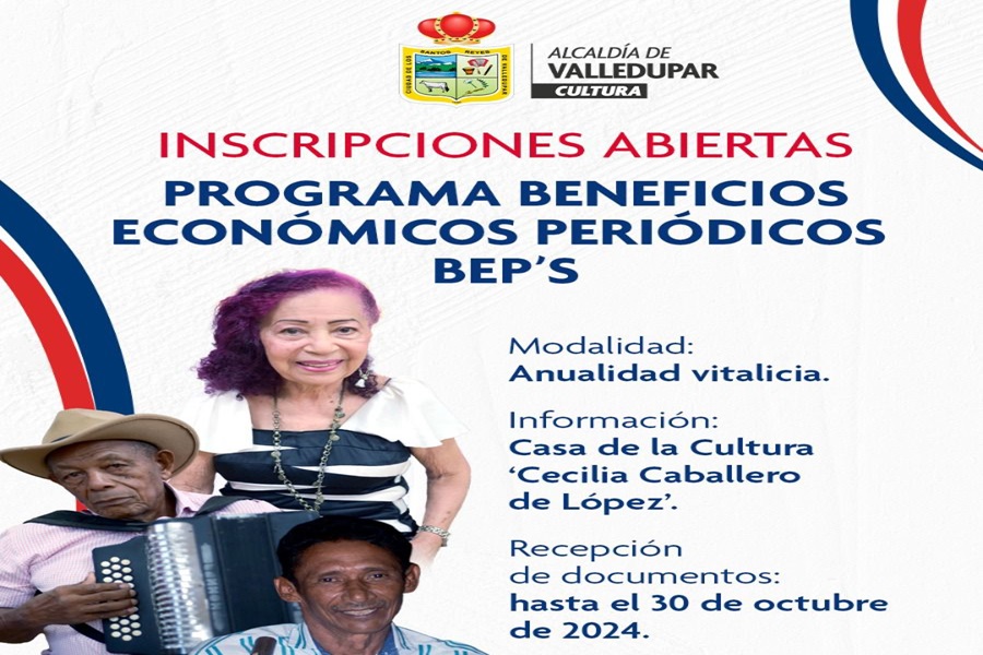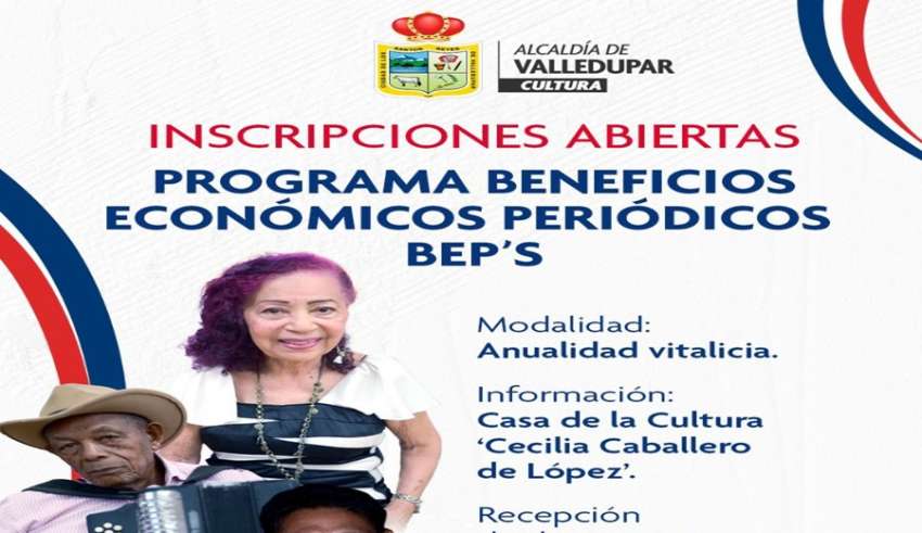En una nueva oportunidad para los gestores culturales de la tercera edad, el Ministerio de las Culturas, las Artes y los Saberes, en conjunto con la Alcaldía de Valledupar a través de su Oficina de Cultura, ha abierto nuevamente las inscripciones para acceder al programa de Beneficios Económicos Periódicos (BEP’s), en la modalidad de anualidad vitalicia.